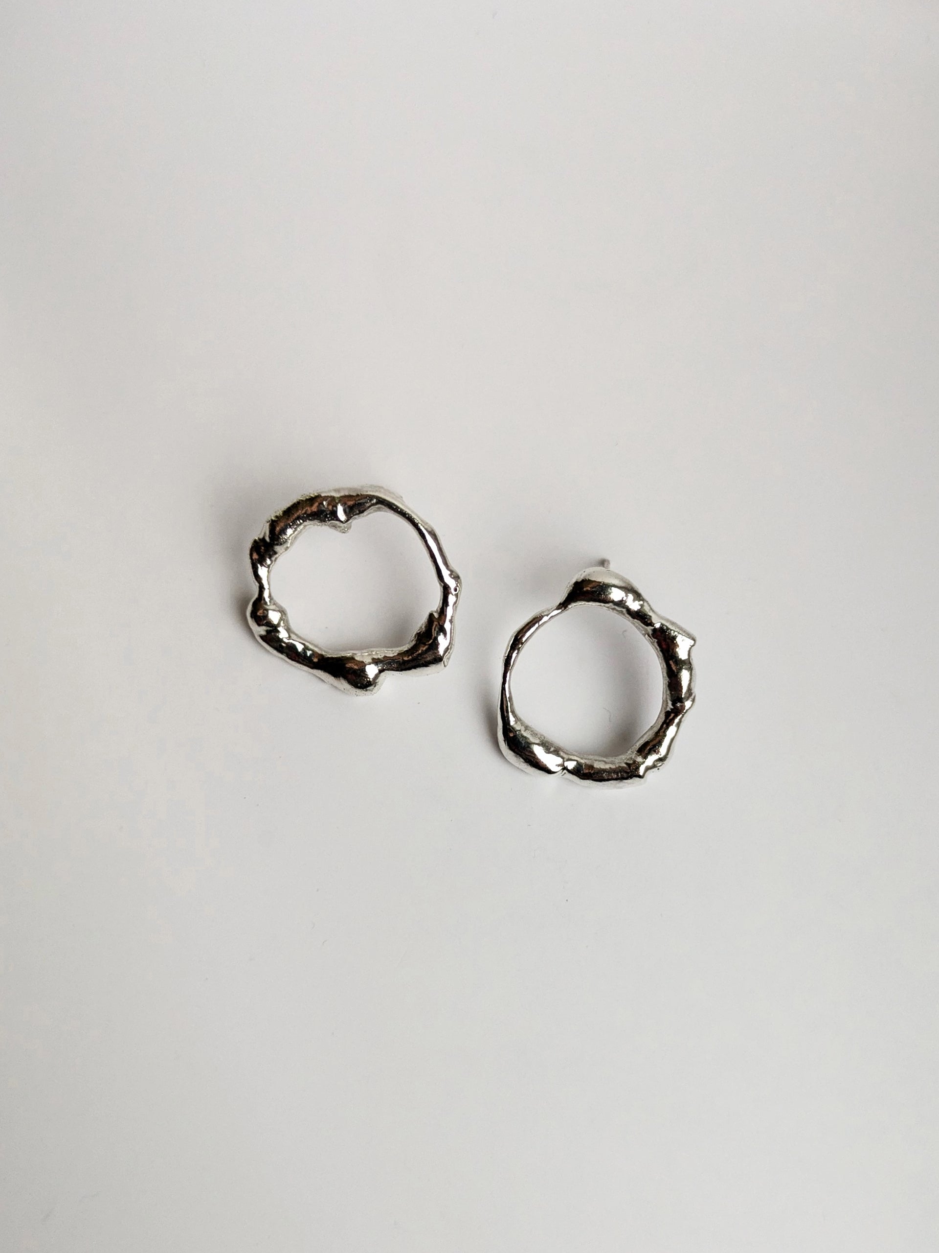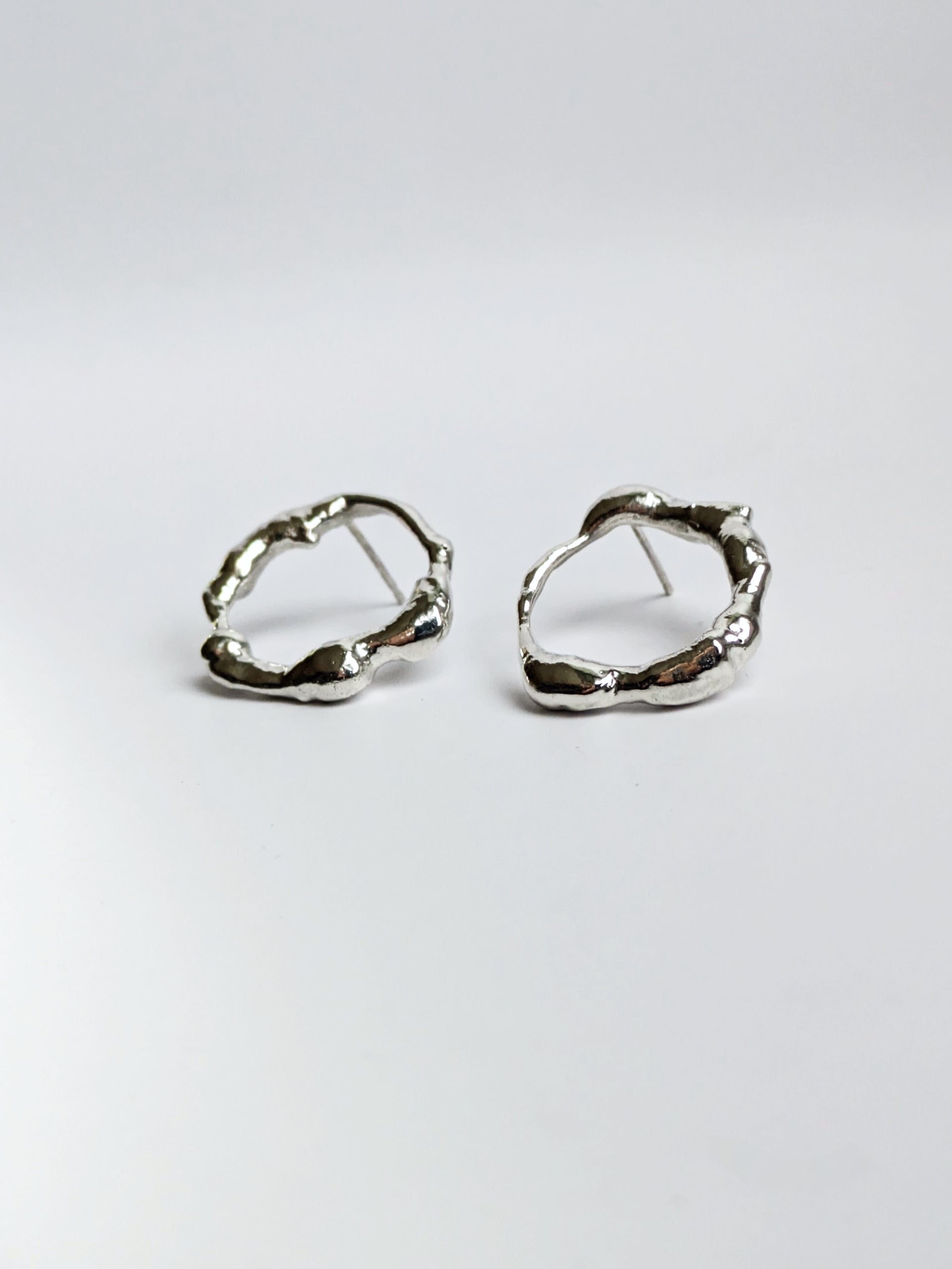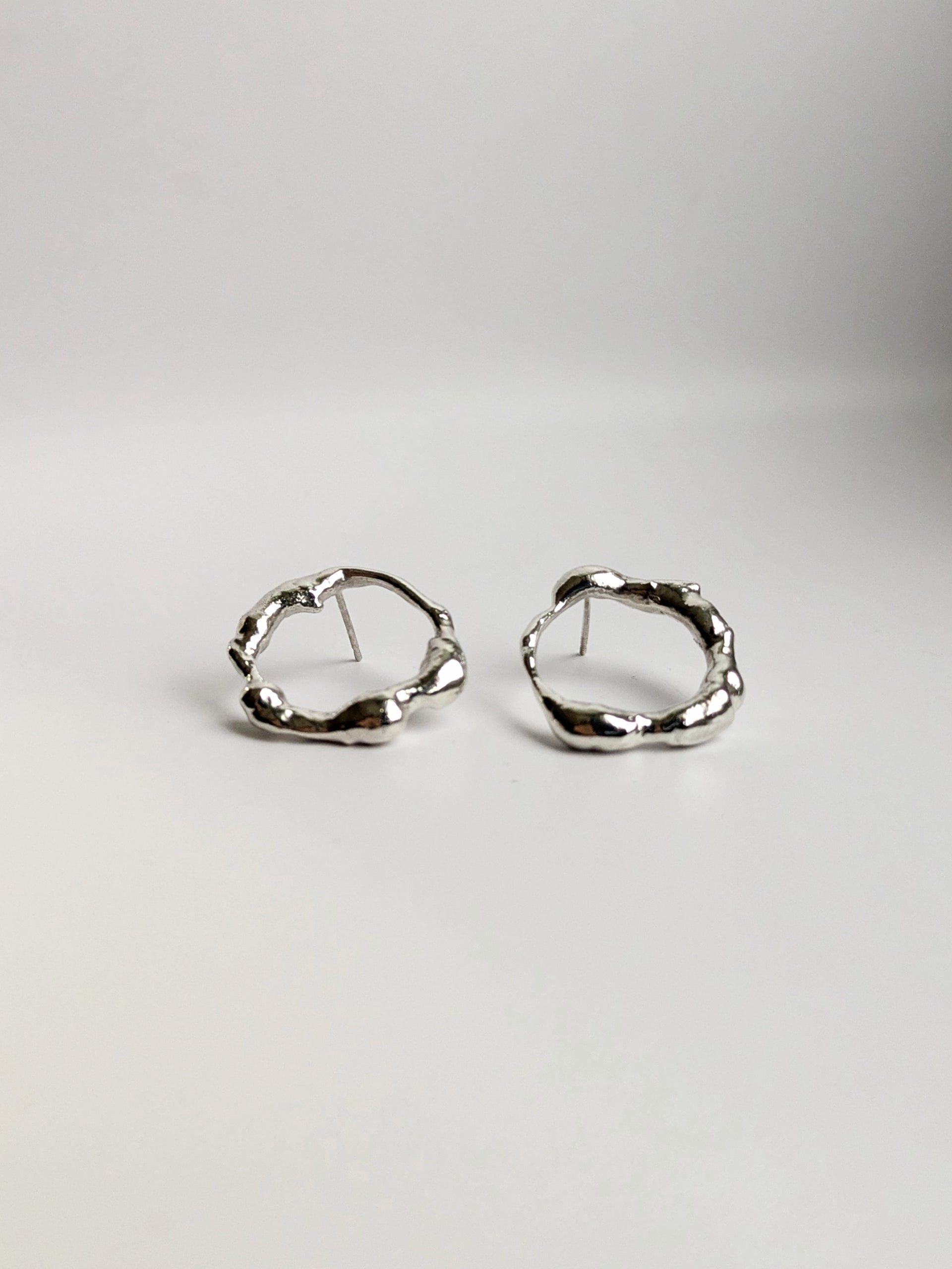 These unique earrings are handmade from recycled sterling silver scraps and off-cuts. Experimenting with process and material these studs are formed in a charcoal mould, resulting in the oozing molten surface you can see.