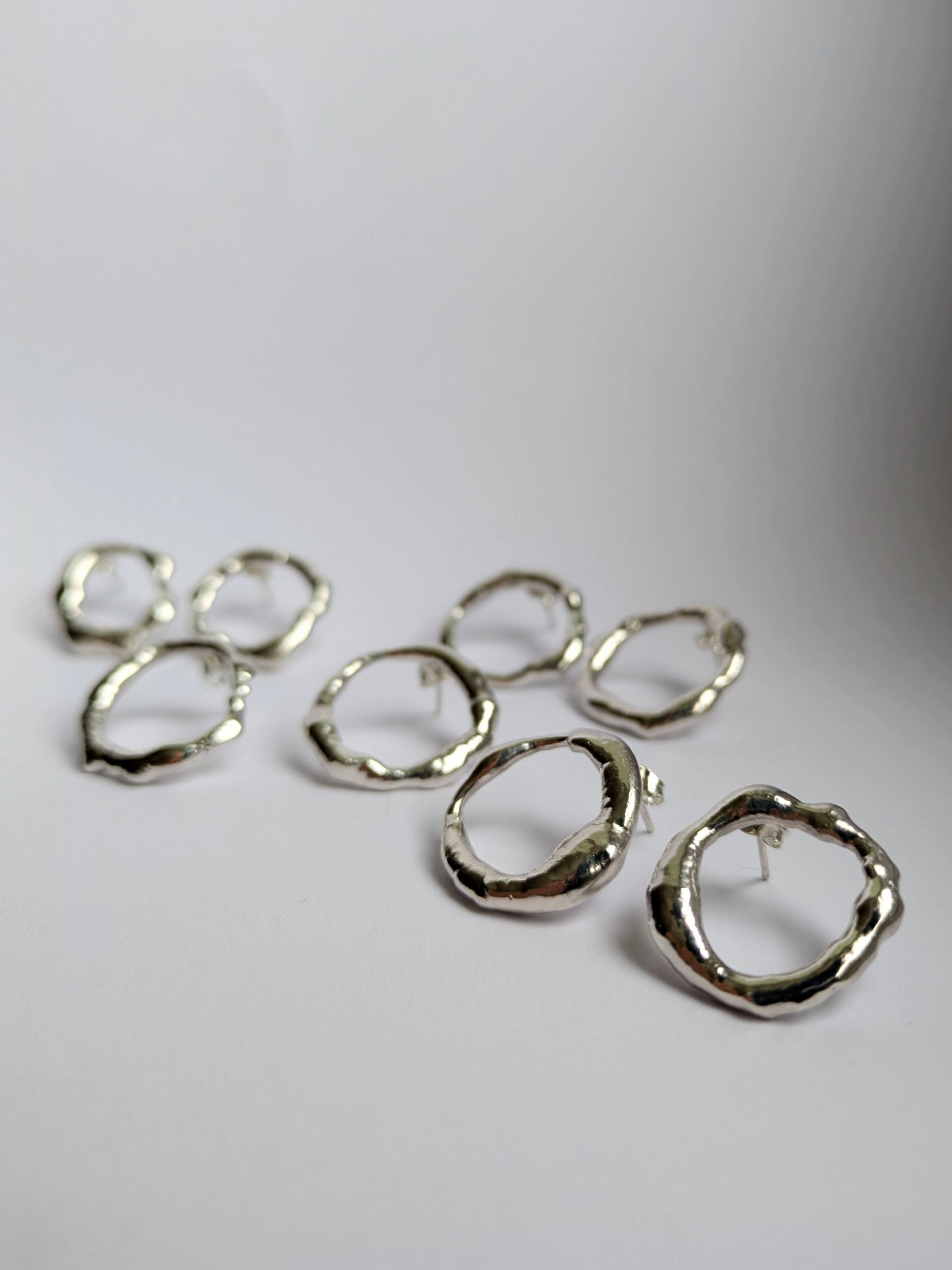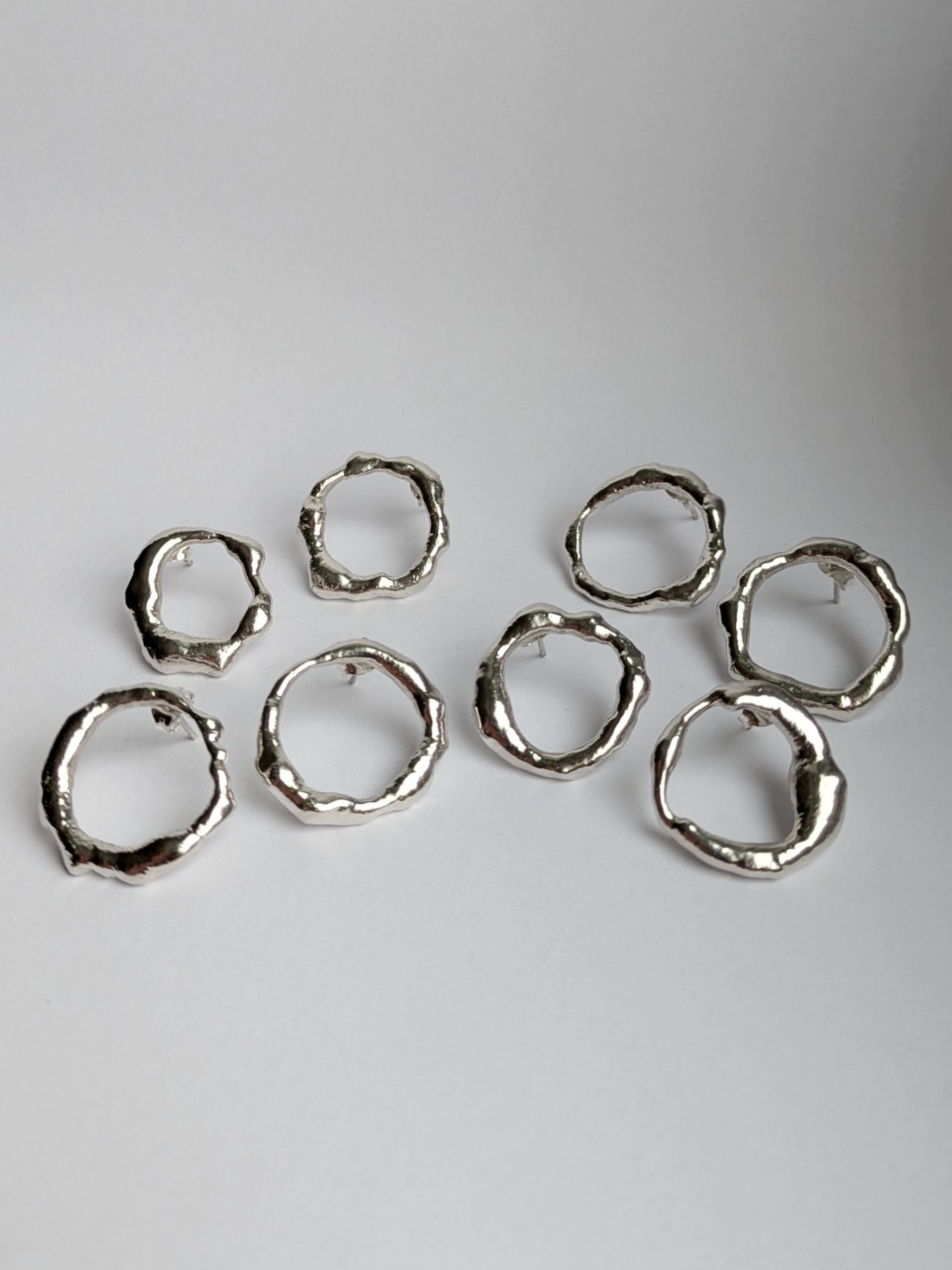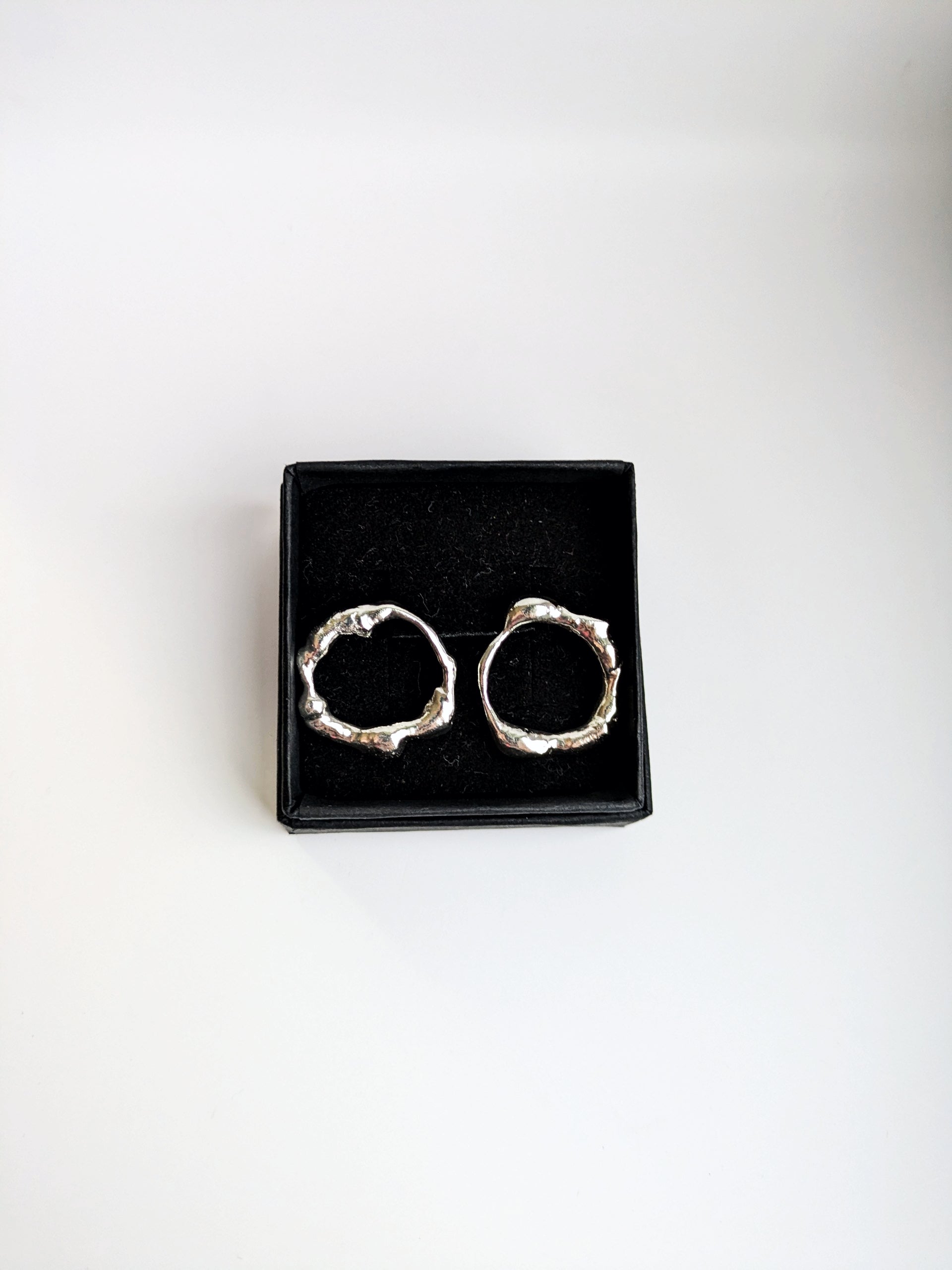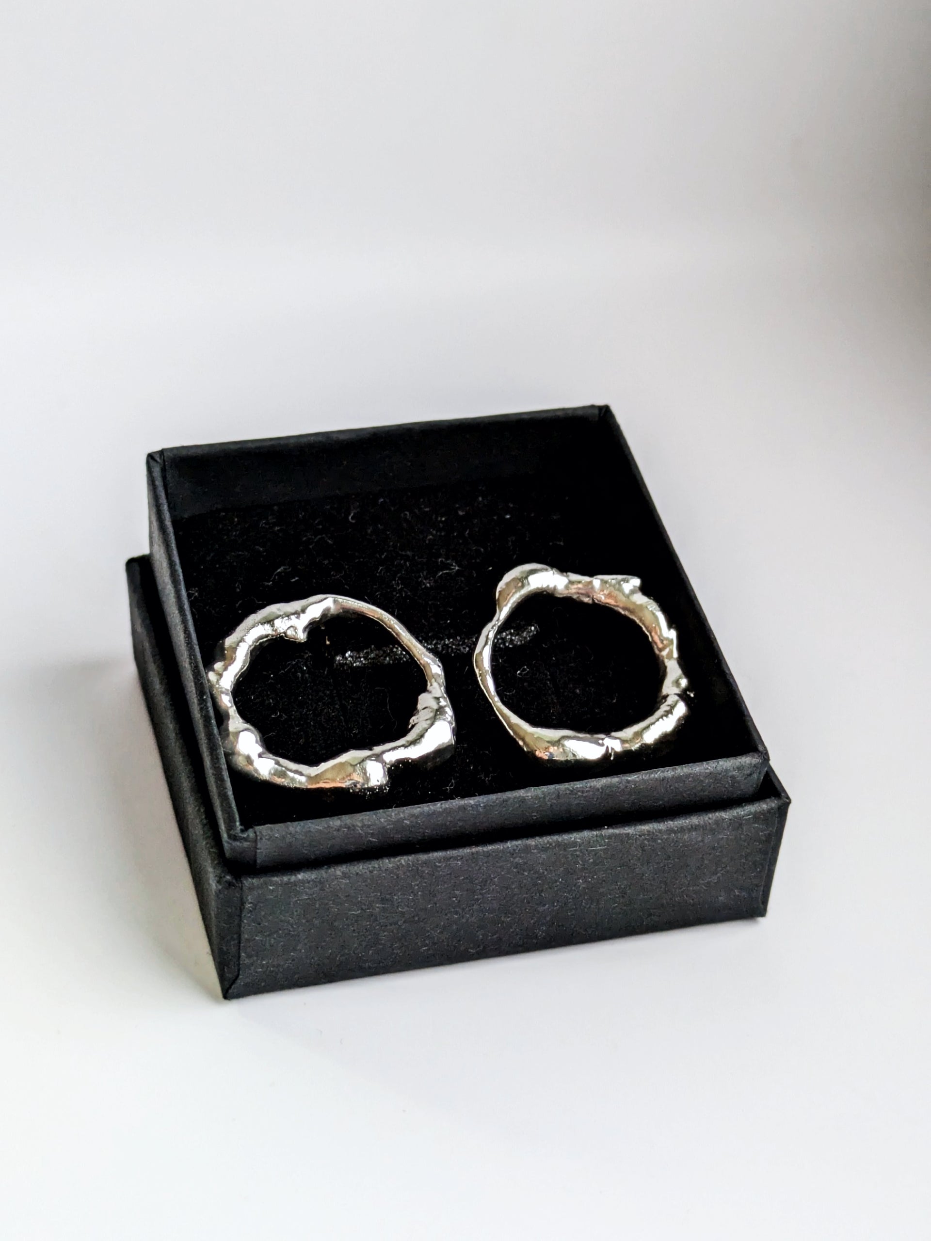These unique earrings are handmade from recycled sterling silver scraps and off-cuts. Experimenting with process and material these studs are formed in a charcoal mould, resulting in the oozing molten surface you can see.