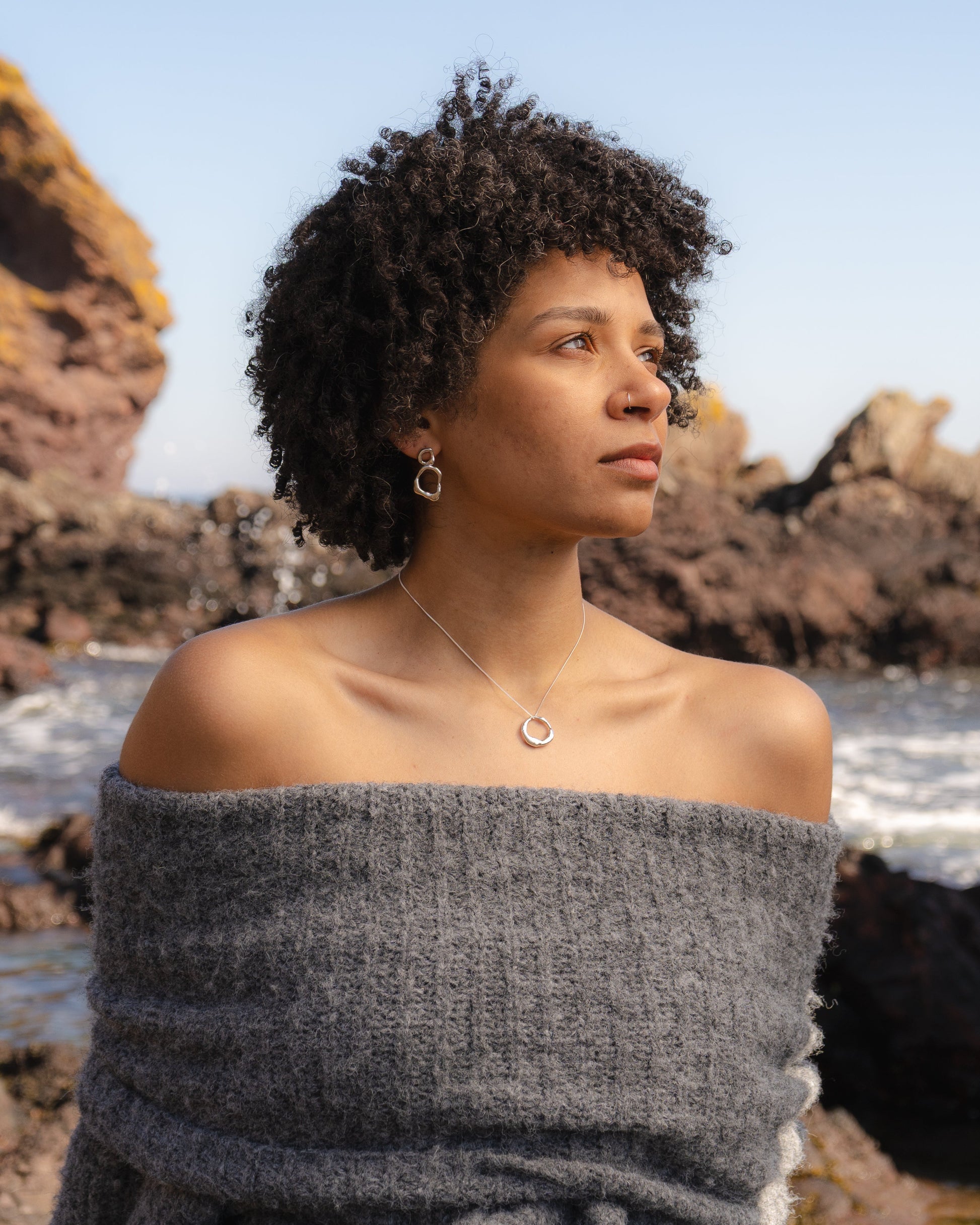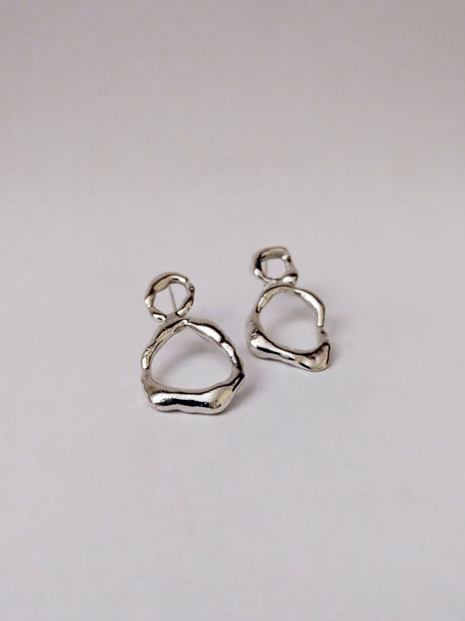 These wee Molten stacked earrings are handmade from recycled sterling silver scraps, collected in our studio as off-cuts from our Main Collection. Inspired by nature in Scotland and using a charcoal mould process, these experimental studs are oozy and organic in shape.